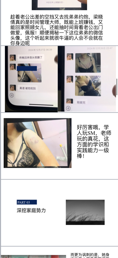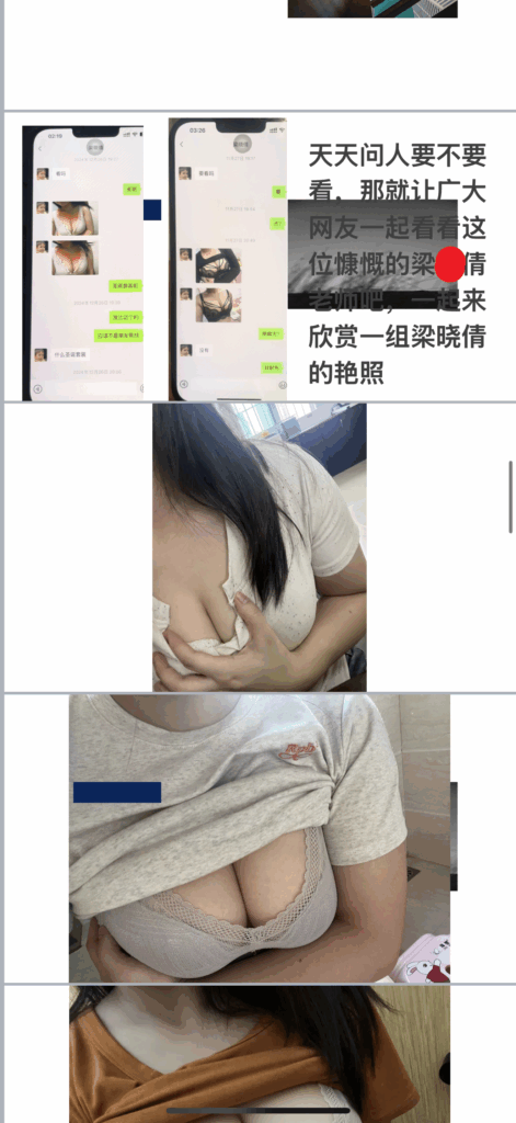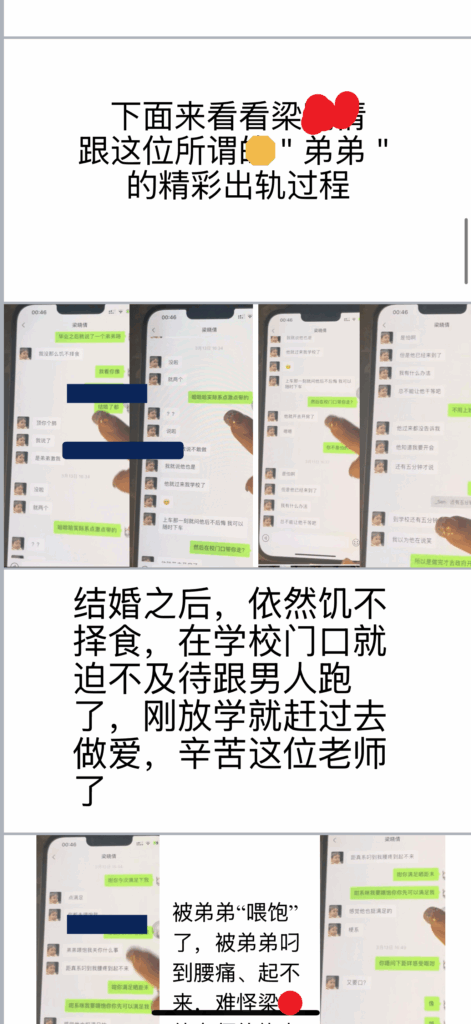 佛山市三水区教育界传出令人震惊的消息,女教师梁晓倩被曝出婚内出轨的丑闻。她的私密视频和聊天记录被曝光,内容令人瞠目结舌!相关聊天记录被整理成PPT格式广泛传播,震动了整个教育圈。