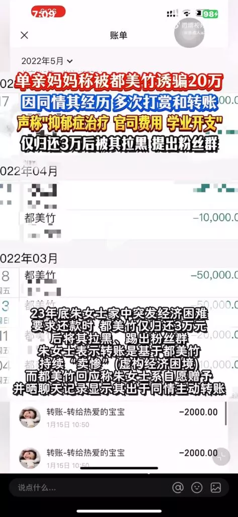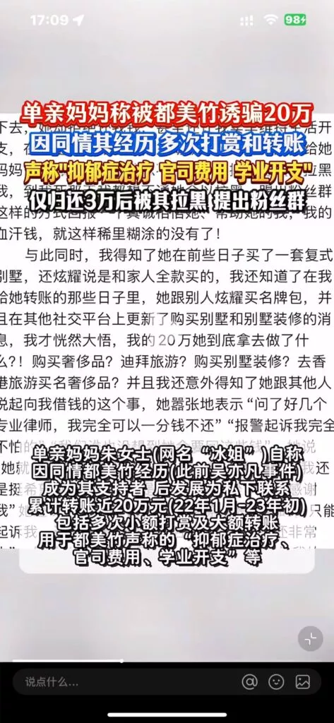 单亲妈妈朱女士发我呢信息称,自己得知都美竹的事情后,因同情多次为支持都美竹打赢官司,转账有一集打赏接近20余万