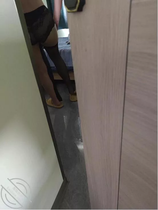 我又开了点门发现我姐门没关,就想着假装上厕所再去瞄一眼。能听见我姐是在换衣服,我就悄悄走过去,特意手机开着,手放在音量键哪里随时偷拍,还真让我拍到了。我姐穿的这搔,黑丝蕾丝内裤和黑丝。