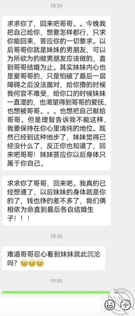 可昨天趁着妹妹洗澡的空档,快速翻看了她的手机,见有一个比较男性的头像点开,看到消息之后感觉天都要塌下来了,, 里面消息不多,只有最近几条, 应该是妹妹每次聊完都把消息删除了,就银秽不堪的信息,把我对妹妹美好的梦击碎了。