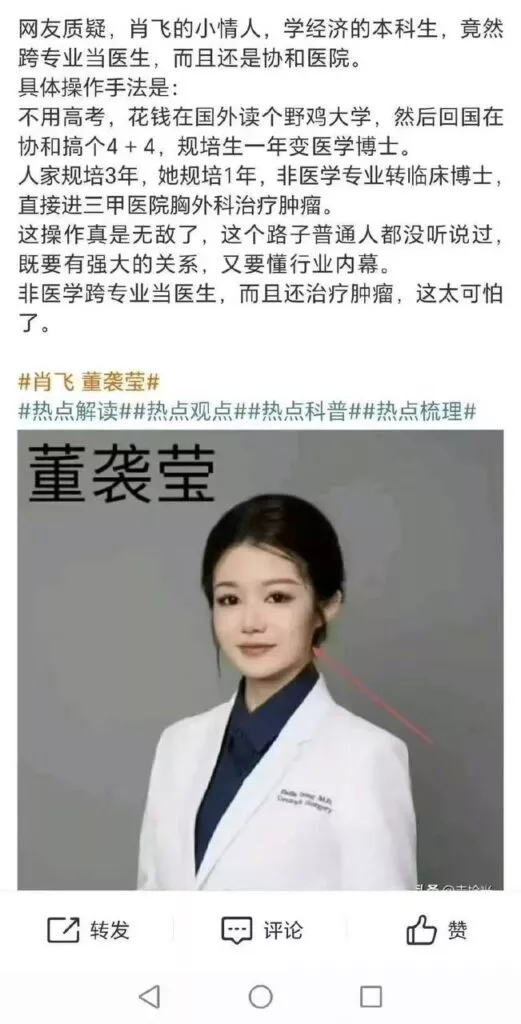 中日友好医院外科副主任肖飞出轨事件登上热搜后,对这位人渣医生的口诛笔伐在网络上一浪又一浪。而事件另一位主角也就是小三董袭莹,则被挖出黑料,大学专业本是财经专业,却能跨专业当起了医生??