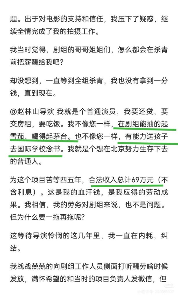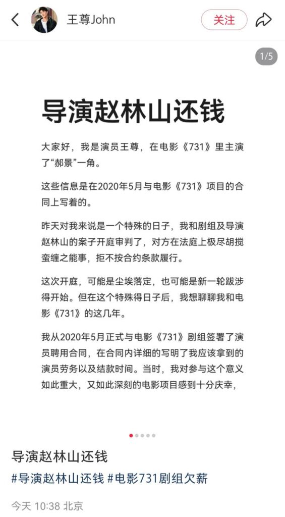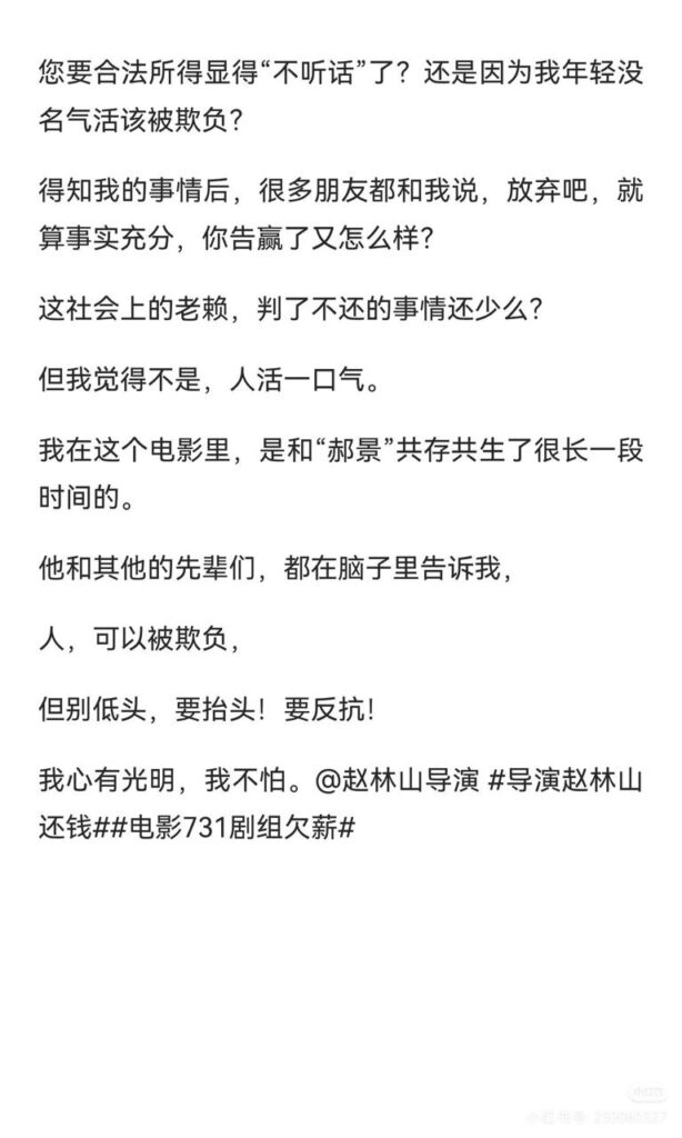 内地电影《731》演员王尊,突然发文指责《731》剧组多次欠薪,其本人声称,在电影拍摄阶段,剧组曾多次遇到停工以及资金问题,是他始终支持导演赵林山完成这部电影,没想到换来的却是被除名以及高达70万元的薪资欠款。